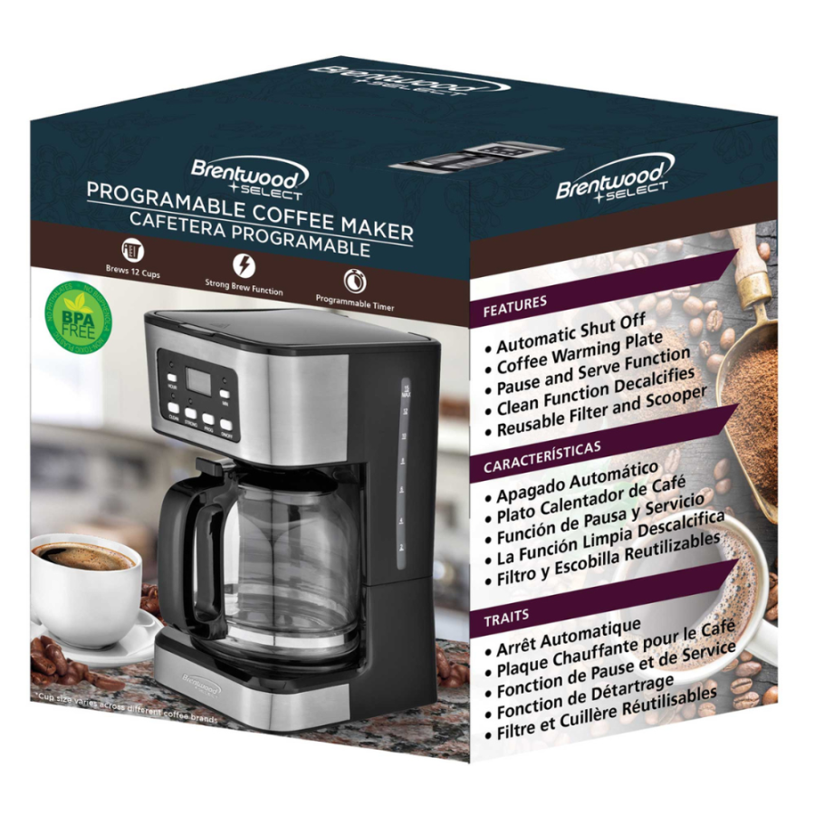 Use the Brentwood TS-222BK 12-Cup Digital Coffee Maker to make a perfect pot of coffee for you, family, friends, and coworkers. Simply place the grounds, add a cup of water and hit the power button to start brewing. Conveniently program the timer for auto brew. Pause and serve mid brew by simply removing the carafe. Make a bolder batch using the “Strong” function. Keep your coffee tasting great by periodically using the “Clean” feature. Warming plate keeps your coffee hot. Coffee maker automatically shuts off after 40 minutes. Save money and help protect the planet using the included reusable mesh filter basket. Use the included reusable scooper to choose the number of cups and strength of your coffee. Never guess with the built-in water level window. Our coffee maker is entirely BPA Free. Removable filter basket makes clean up a breeze.