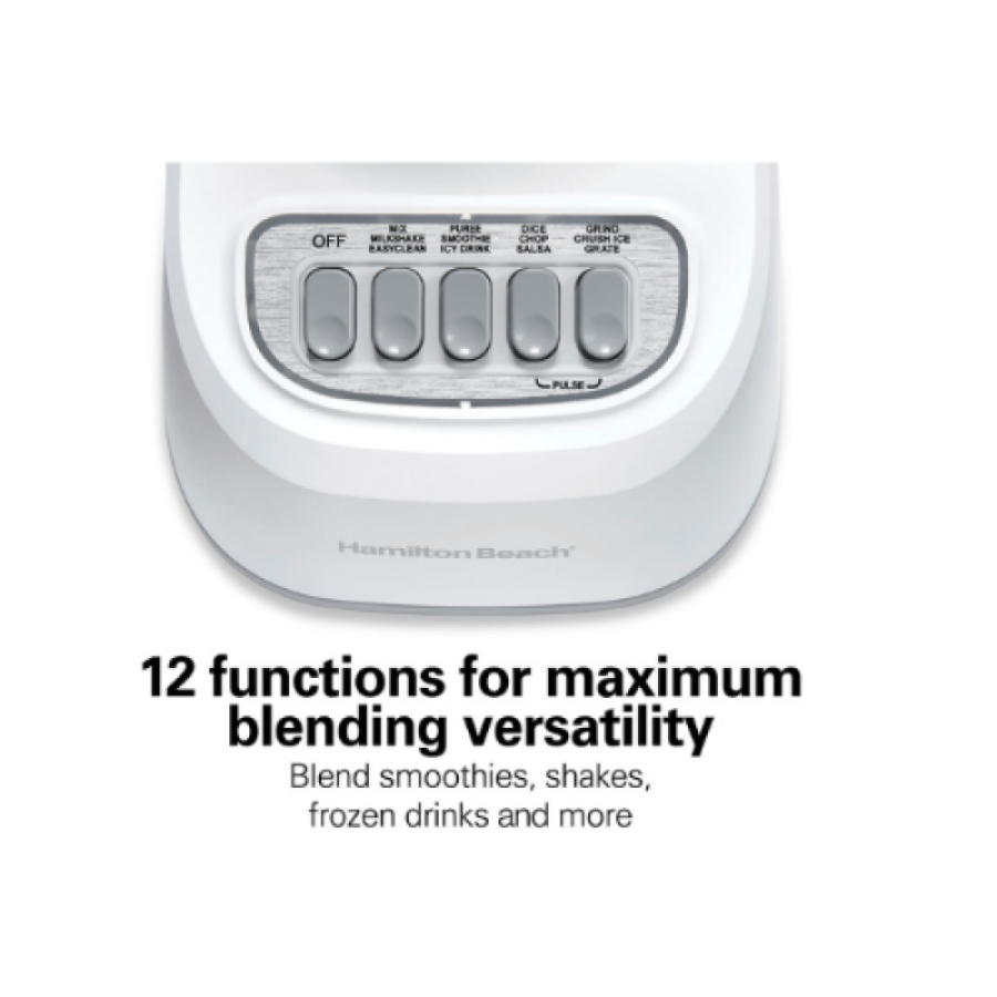 The 12 functions provide maximum versatility for every blending job, and the 5 simple buttons clearly indicate each function, so there's no guesswork. Built with a new quieter blending design, the Smoothie Blender minimises noise. Serving is easy because the BPA-free 48 oz. blending jar has a convenient pour spout to eliminate messy drips, and the removable filler-cap on the lid makes it easy to add ingredients as you blend. Built for long-lasting performance.