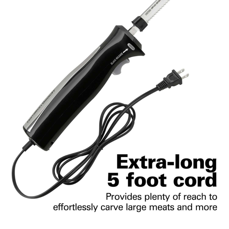 The Hamilton Beach Electric Knife Set is a versatile kitchen tool featuring a powerful motor and reciprocating stainless steel blades, designed for effortless and even slicing of meats, bread, and even crafting foam. It typically includes a carving fork and a compact case for convenient storage.