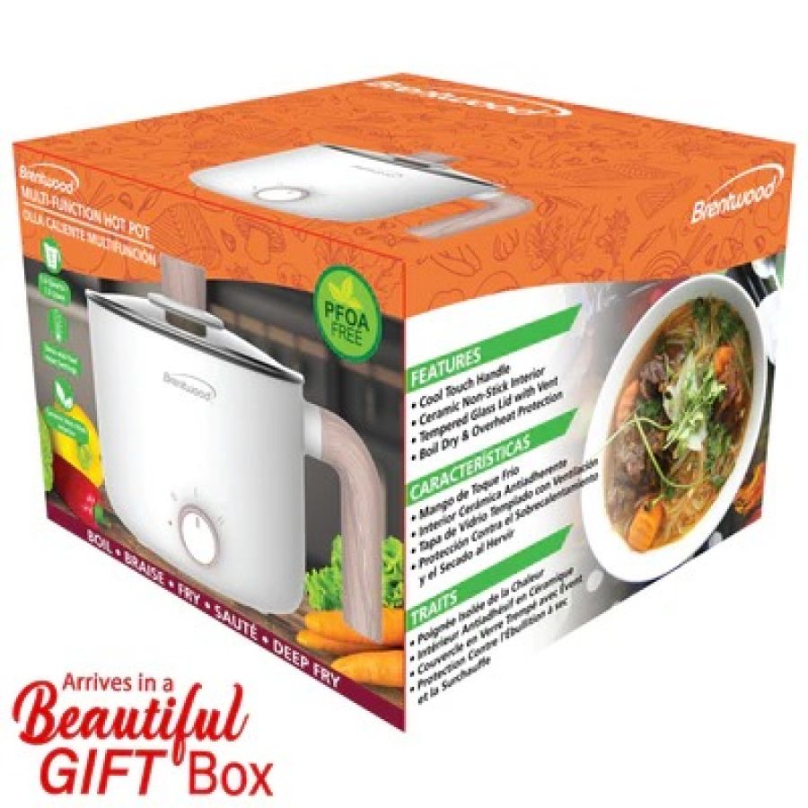 Use the 600w Brentwood HP-3170W 1.5-Liter Multi-Function Electric Hot Pot Cooker with Ceramic Non-Stick Coating to boil, fry, and sauté fresh or frozen food and heat up leftovers. Prepare everything from authentic hot pot, ramen, and pasta to chicken, steak, eggs, and veggies. Deep enough to deep fry French fries, fish, chicken strips, mozzarella sticks, and more. Simply detach the power cable and use the large cool touch handle to move from kitchen to dinner table. Perfect for homes big and small, ranging from houses, apartments, to dorm rooms. Also perfect for travel from hotel rooms to RVs. Features slow and fast heat settings, easy to clean non-stick ceramic interior, and vented tempered glass lid. Safely cook with the deep and wide hot pot, vented tempered glass lid, power indicator light, cool touch handles, and overheat and boil dry auto shut off.