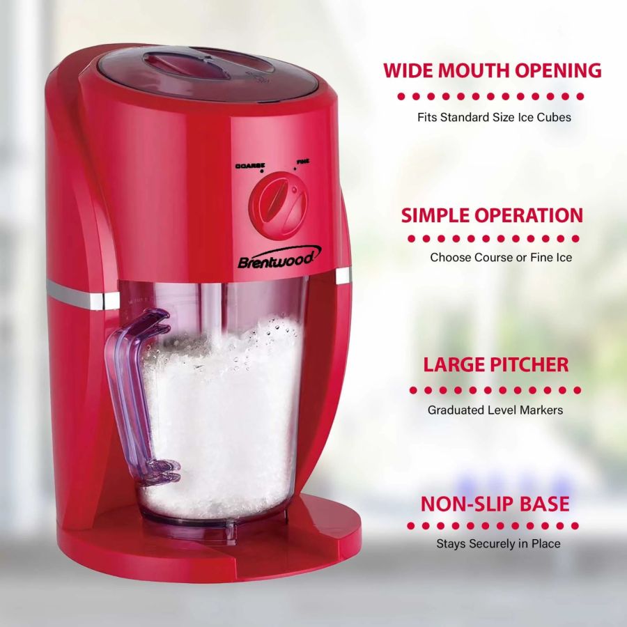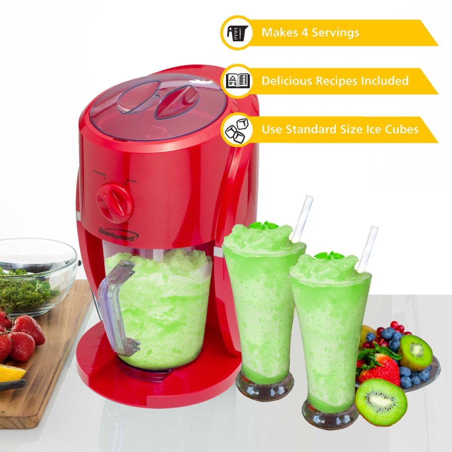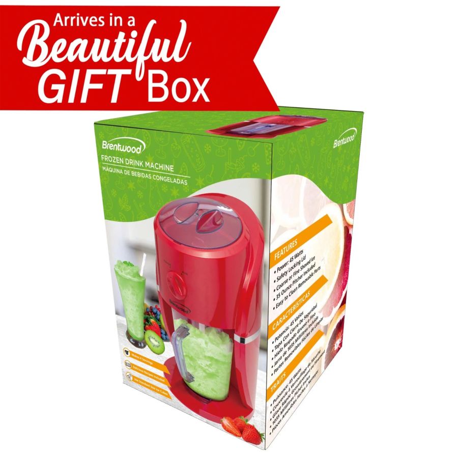 Use the 45 watt Brentwood TS-1425R Margarita and Frozen Drink Machine to create deliciously cool drinks. Make margaritas, slushy lemonade, cola, and much more. Iced beverages are mixed directly into the included reusable 35oz pitcher. Follow the guidelines on the pitcher for effortless mixing. Easily operate between coarse and fine ice shavings for all kinds of fun drinks. Lid, ice chamber, and mixing arm are removable for effortless cleanup.