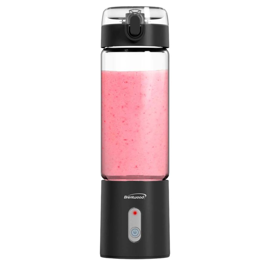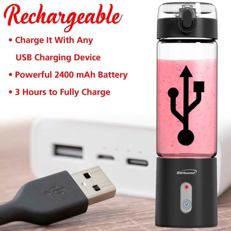 Use the Brentwood RJB-100BK 17oz Portable Battery Operated USB Blender with 8 Blades & Glass Jar to easily blend delicious fruit smoothies, protein shakes, and more, on the go. Fast and efficient single button operation produces drinks in just 25 seconds thanks to the powerful 2400 mAh battery. Simply plug it in to any USB charging device and enjoy up to 10 drinks on the go on a single, full charge. Conveniently know when it’s time to charge with the 4 convenient battery level indicator lights. Includes an 8 leaf stainless steel blade assembly and a BPA Free 17 ounce glass jar with sipping sports lid. Perfect for mixing full servings of smoothies and protein shakes. Space saving design takes up little counterspace and makes for easy storage. Removable blade assembly, jar and lid are dishwasher safe.