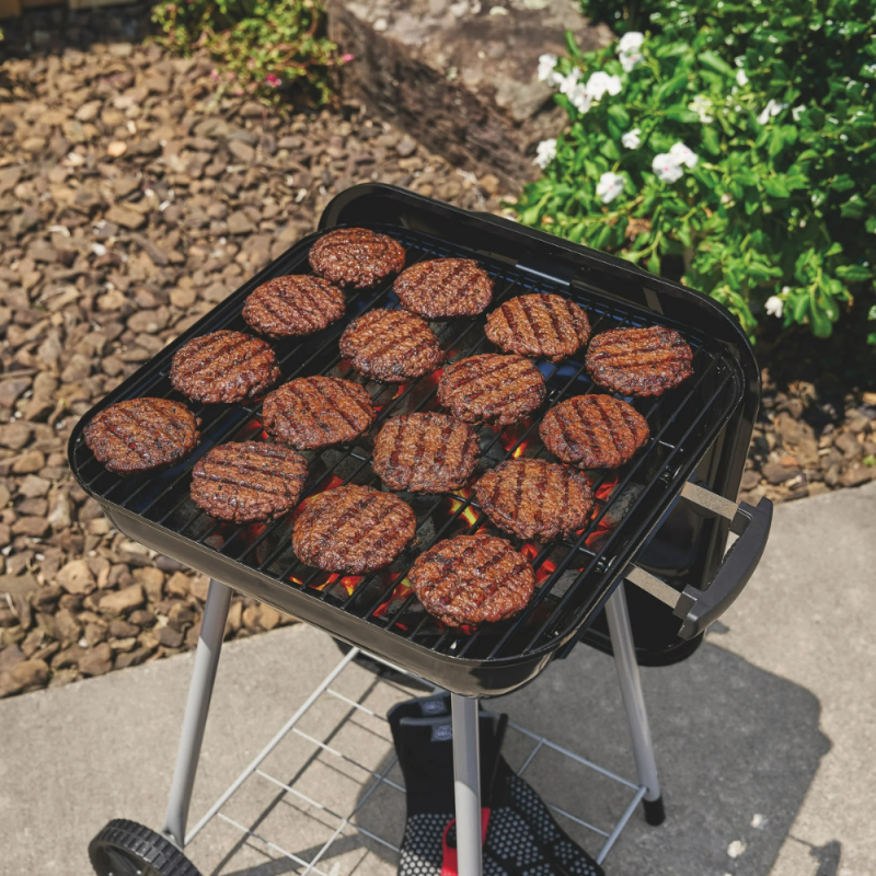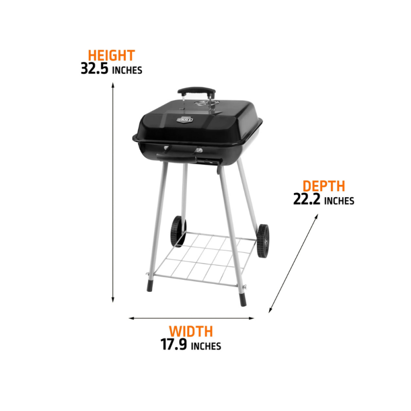 The Expert Grill 17.5-inch Charcoal Grill is a compact, budget-friendly, black steel grill ideal for small gatherings, offering 302 sq. inches of cooking space for about 16 burgers, featuring durable porcelain-coated parts, adjustable dampers for heat control, wheels for mobility, and easy assembly, making it a solid, portable option for backyard grilling