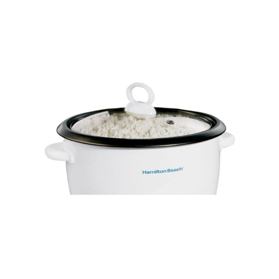 The Hamilton Beach 10-Cup Rice Cooker is specified as a corded electric appliance (120 volts) designed for ease of use, with a capacity that yields up to 20 cups of cooked rice from a maximum of 10 cups of uncooked rice. Key features include easy one-touch automatic cooking, which shifts to a warm setting when the food is ready, and a non-stick aluminum inner pot and plastic or glass lid that are often dishwasher safe. The cooker typically weighs around 5 pounds.