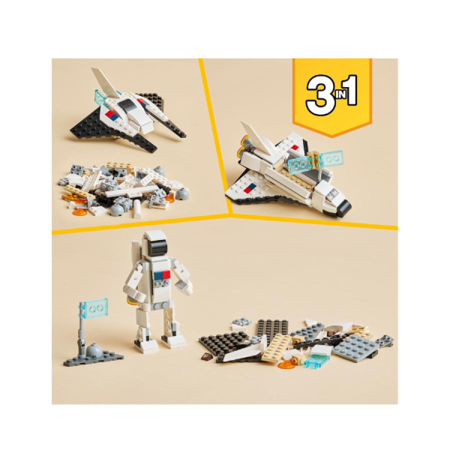 The LEGO Creator 3-in-1 Space Shuttle is a 144-piece set for ages 6+ that allows builders to create three different models: a space shuttle with an opening hatch and satellite, a posable astronaut with a jetpack, or a spaceship