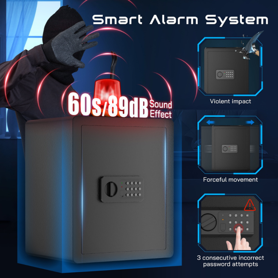 - 【Sturdy & High Security Performance】The fireproof safe is made of durable solid steel structure, 60mm thickened embedded door design enhances anti-pry ability, 30mm reinforced solid locking bolts effectively resist physical attacks, the advanced locking technology resists physical attacks and lock manipulation to ensure the safety of your valuables. This small home safe has been rigorously tested to prove its superior durability and material quality