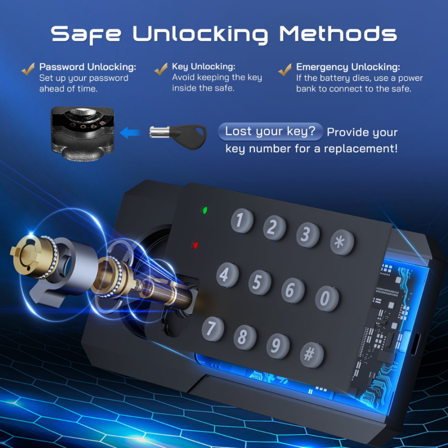 - 【Smart LED Light & Keyboard Silent Mode 】①The interior LED light improves visibility so you can easily access your valuables in the dark. Also, the home safety box’s indicator light will remind you that the battery is about to run out by lighting up a red light. ②Optional silent mode, Press and hold *, then press 8 to freely turn on/off silent mode, protecting your family's sleep from being disturbed.