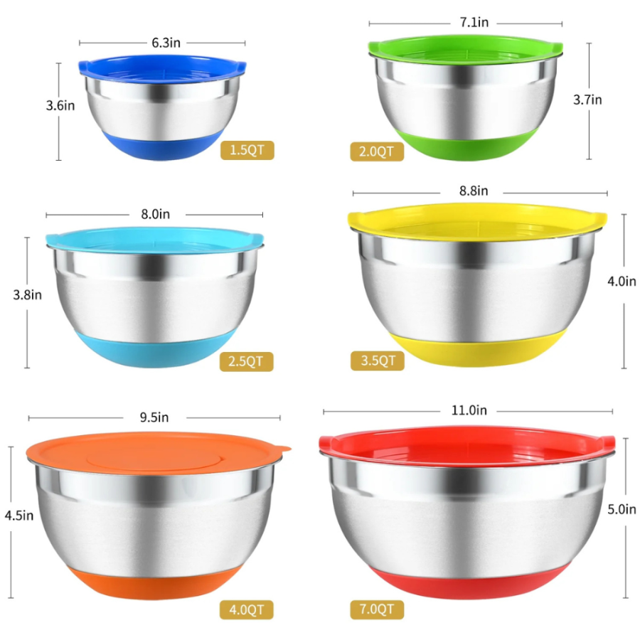 - -Various Bowl Sizes: The TINANA stainless bowls with lids offers larger sizes than standard stainless bowls set, making them perfect for larger servings. These stainless steel bowls with lids have depths that make them great for mixing large batters, tossing salads, washing vegetables, marinating, and storing food. Ranging from 0.7 to 7 quarts, these bowls provide the flexibility you need to handle any food prep task.